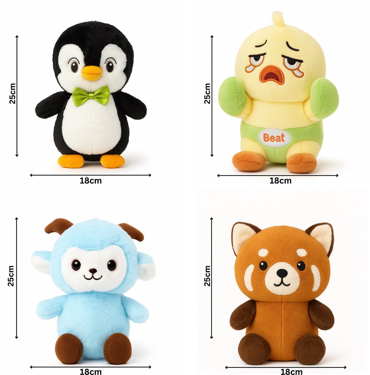 - Soorten: schattig schaap, lieve pinguïn knuffel, bruine beer knuffel, schattige eend