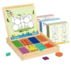 Inhoud:Â Houten doos met compartimenten, vormkaarten en gekleurde geometrische puzzelstukken