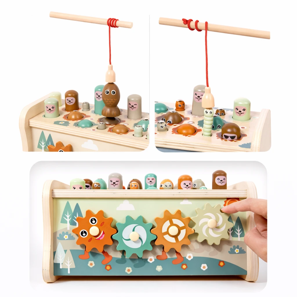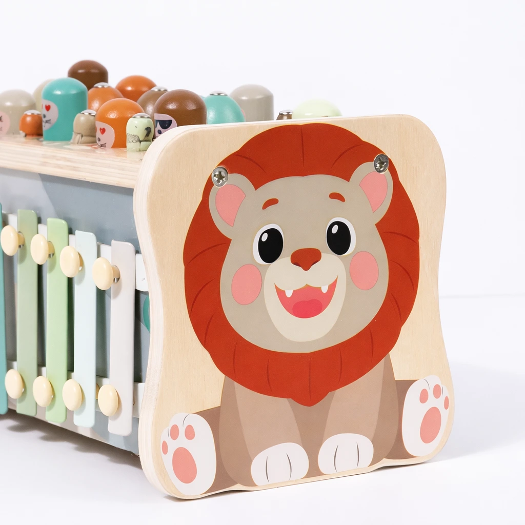 Kinderen kunnen de kleurrijke figuren naar beneden tikken, muziek maken met de xylofoon en de tandwielen laten draaien. Dit stimuleert motorische vaardigheden, hand-oog coördinatie en creativiteit. Dankzij het stevige houten ontwerp is dit speelgoed duurzaam en veilig voor dagelijks gebruik.