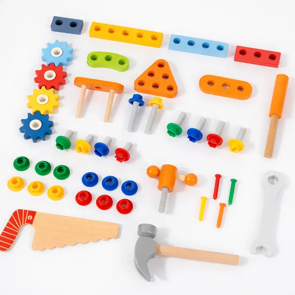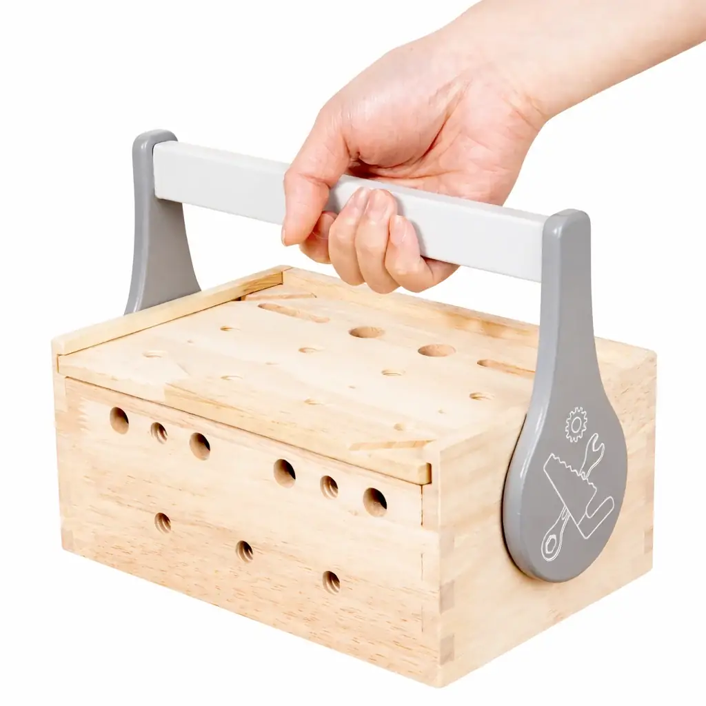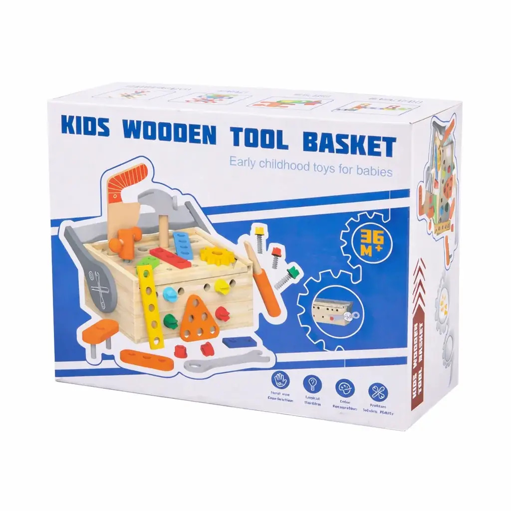 Deze houten kinder gereedschapskist met 57 onderdelen laat kinderen spelenderwijs bouwen, schroeven en combineren. Het stimuleert fijne motoriek, probleemoplossend denken en creativiteit. Gemaakt van stevig, glad afgewerkt hout en perfect als leerzaam speelgoed voor kinderen vanaf 3 jaar.