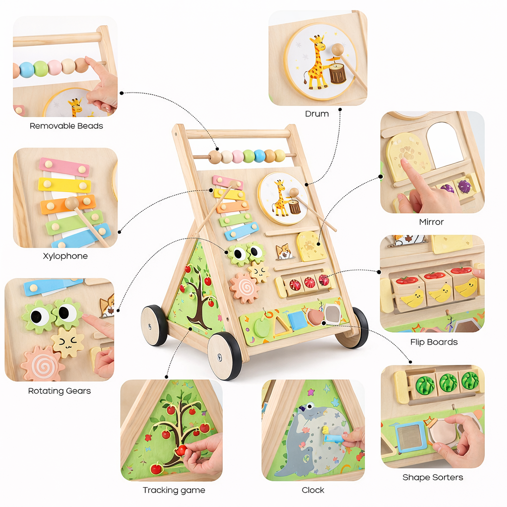 Stevige houten loopwagen met muziek, vormen en activiteiten. Stimuleert motoriek, balans en spelenderwijs leren. Geschikt vanaf 1 jaar.