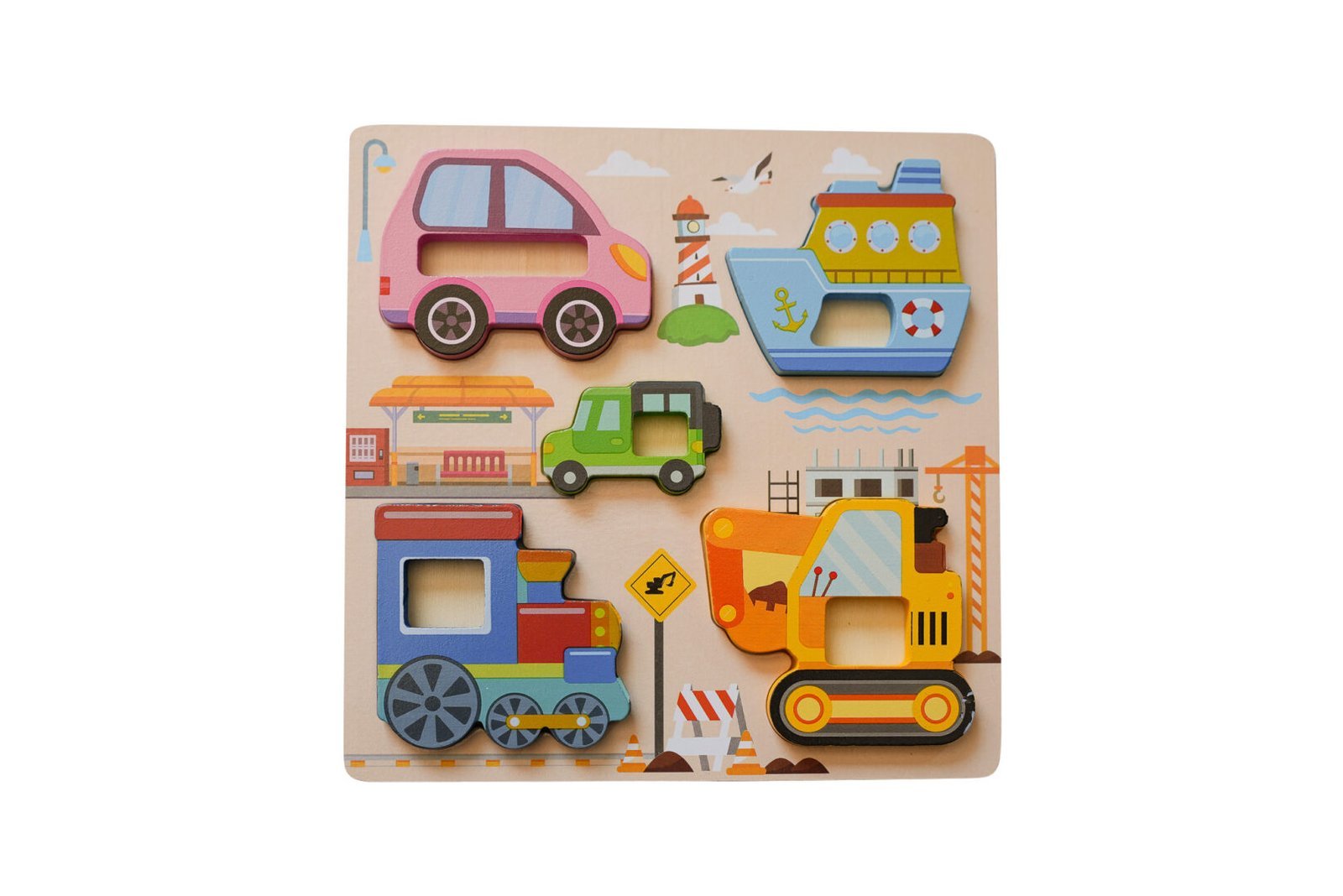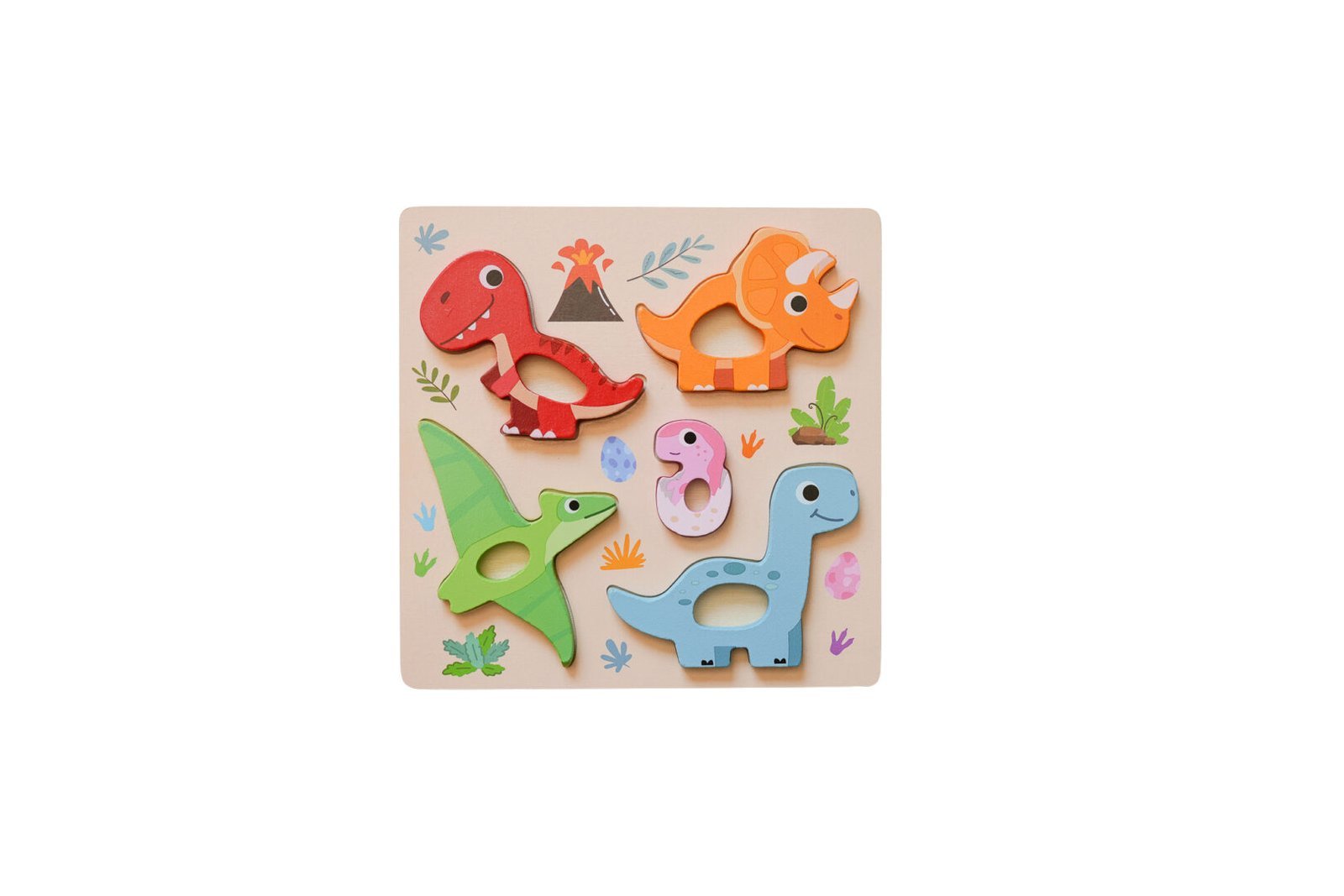 - Deze set bestaat uit vier kleurrijke houten inlegpuzzels, elk met een uniek en leerzaam thema: voertuigen, zeeleven, bosdieren en dinosaurussen.