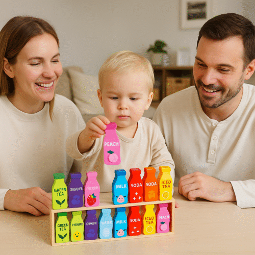 Laat je kind spelenderwijs leren met deze vrolijke Houten Drink Matching Game!