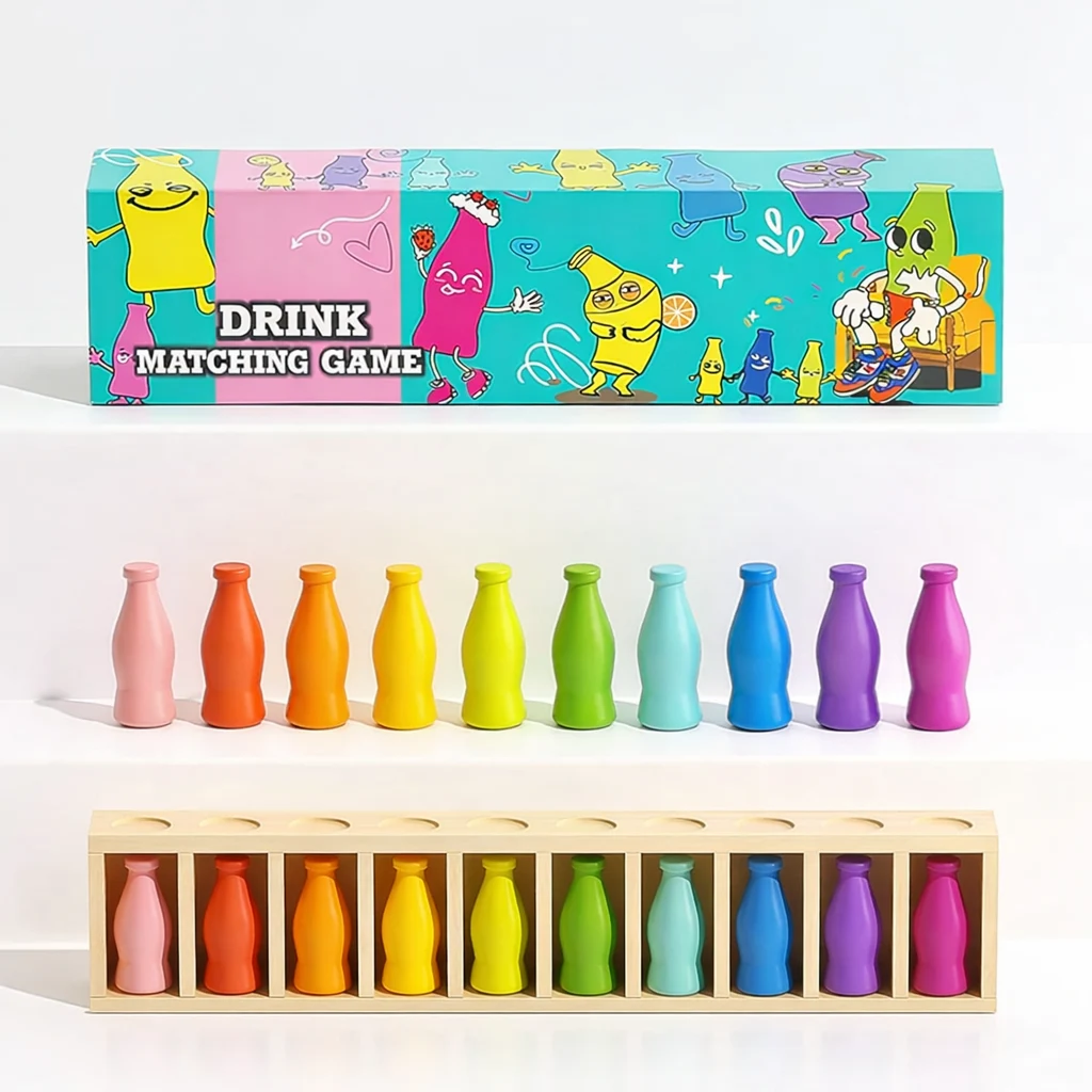 Laat je kind spelenderwijs leren met deze vrolijke Houten Drink Matching Game!
