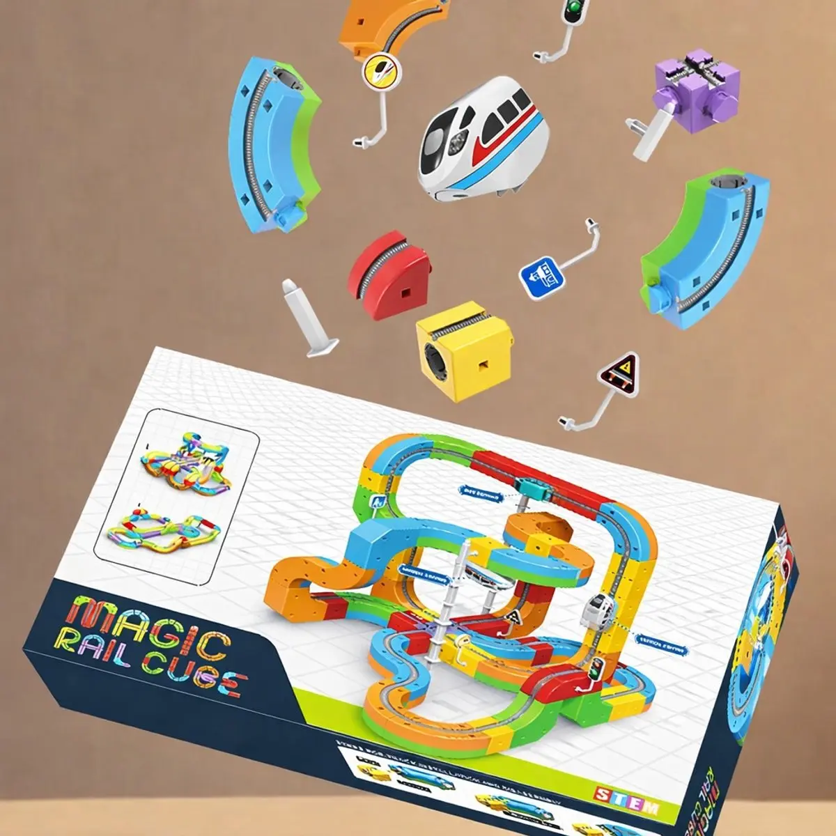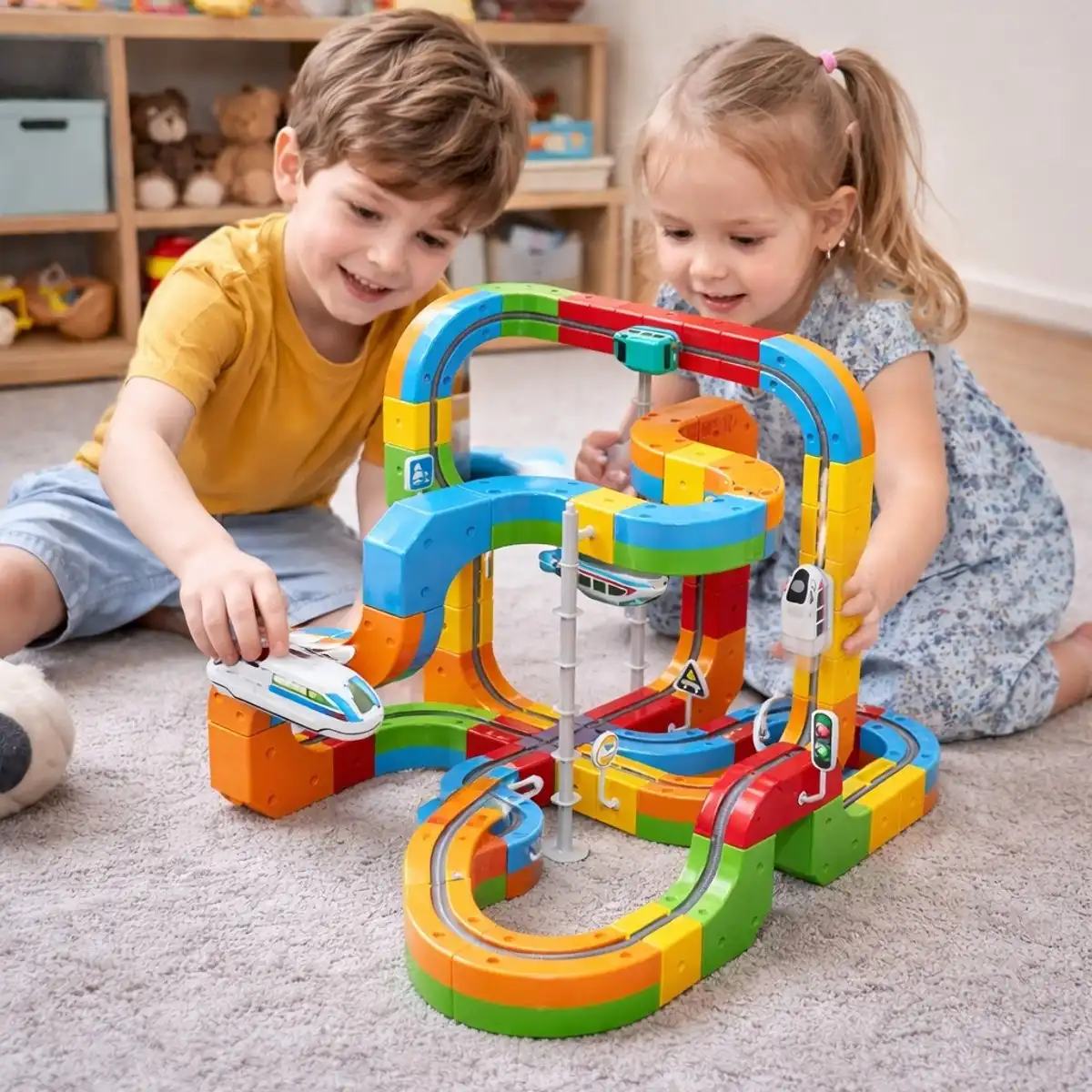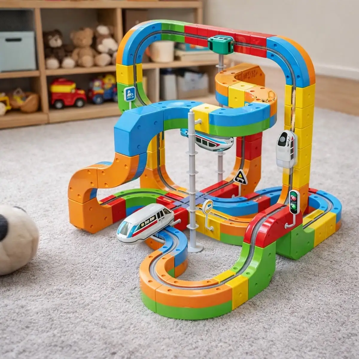 De set bevat verschillende baandelen, accessoires en voertuigen, waardoor kinderen eindeloos kunnen variëren en nieuwe routes kunnen creëren. Dit speelgoed stimuleert niet alleen creativiteit, maar ook logisch denken en probleemoplossend vermogen. Perfect voor jonge ontdekkers die houden van actie en techniek.